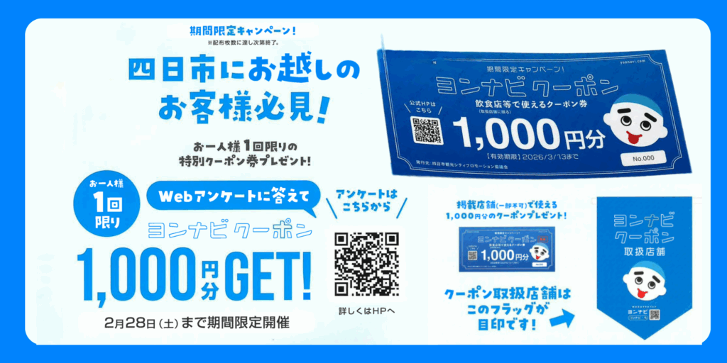 アンケートにお答え頂ければヨンナビクーポン1,000円分をお渡し致します。